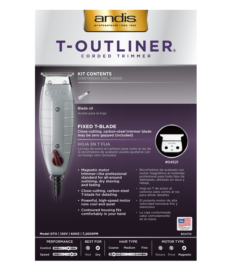 No detail is too small for those who love the craft. Magnify your finest work with the T-Outliner® Trimmer. Ideal for precise outlining, dry shaving, and fading, these ultra-sharp, carbon-steel T-blades cut close and exact. Inside, the magnetic motor churns an impressive 7200 SPM that makes finishing work quick and smooth. The contoured, glossy gun-metal gray body is easy to hold and stays put for long shifts behind the chair. Celebrate the little things with the T-Outliner Trimmer, precision cutting power for professional creators.